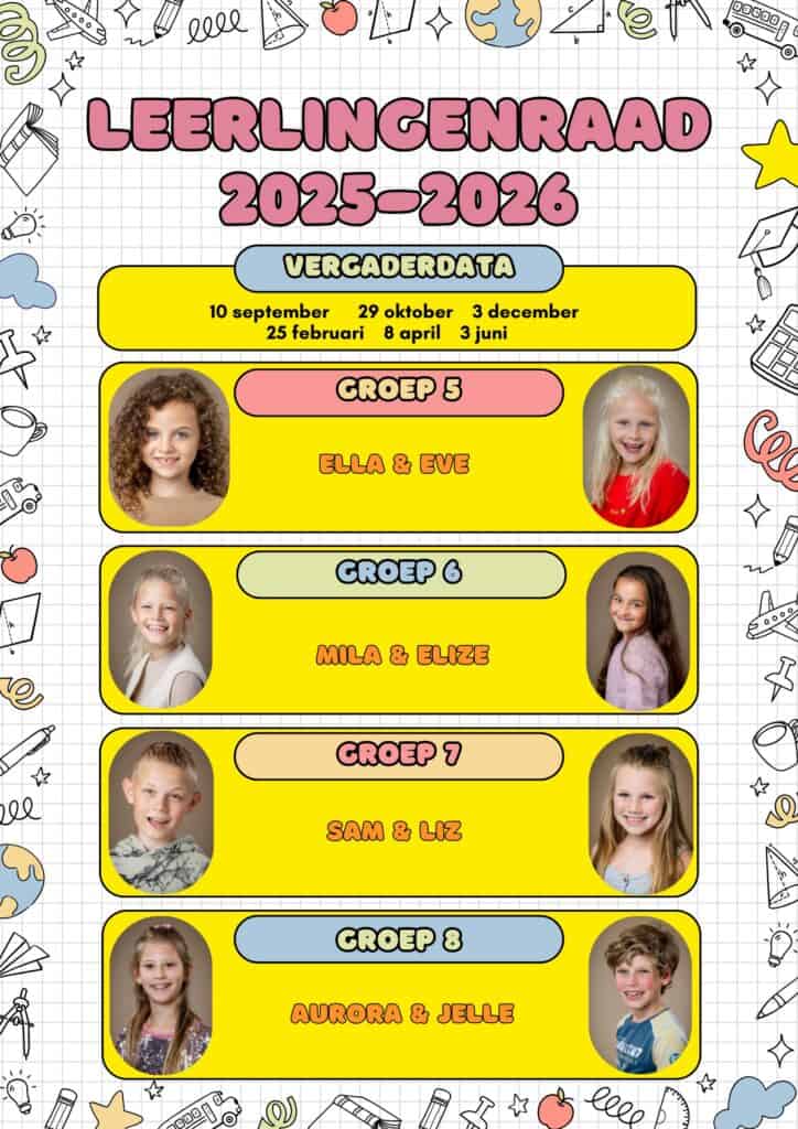 Hieronder ziet u de leerlingenraad van vorig schooljaar. Begin schooljaar 2025/2026 zullen er in groep 5 nieuwe verkiezingen worden gehouden en schuiven alle leerlingen een plekje door.